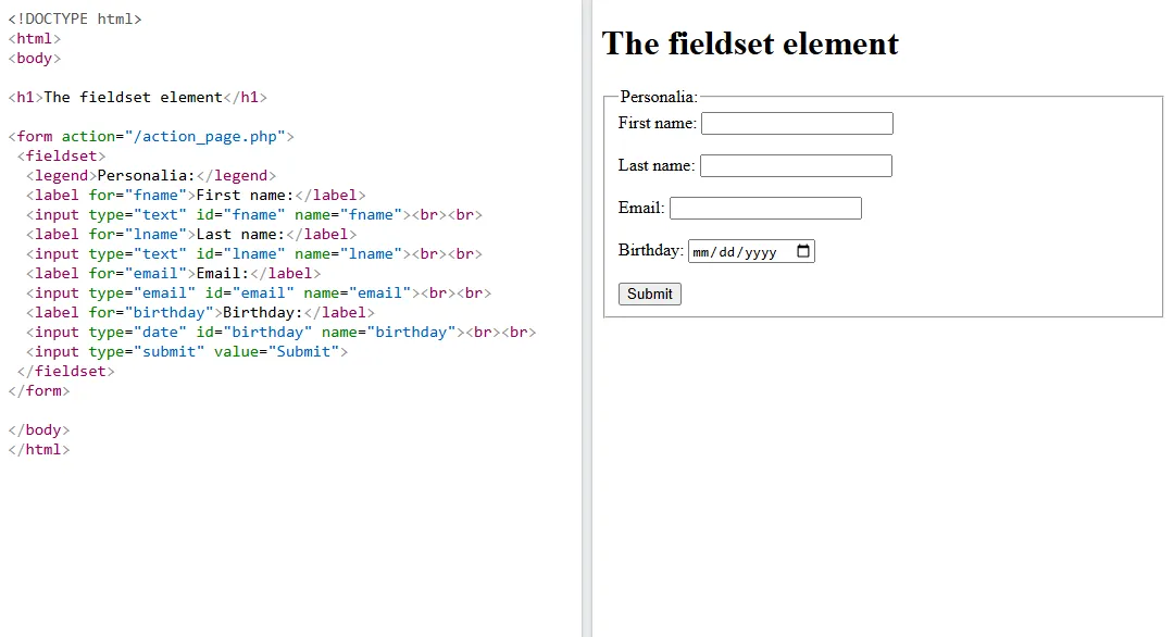 FieldsetUsed to group related form elements, making the form more structured and easier to understand andLegendprovides a title or description for the grouped fields.